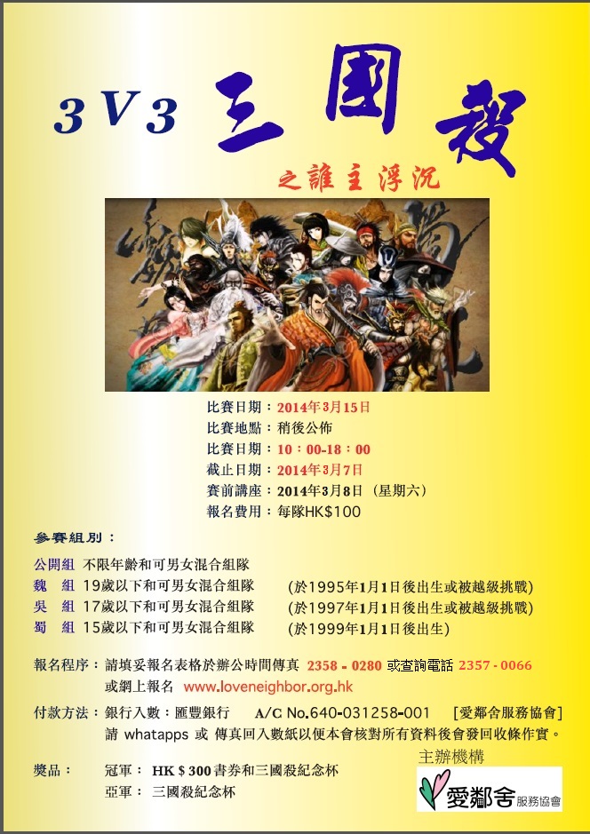 | 報名方法: | 請填妥申請表格傳真至 2358-0280 或 網上報名 www.loveneighbor.org.hk 主辦單位核對所有資料後將會以電話聯絡,收到通知後即可入數。 |