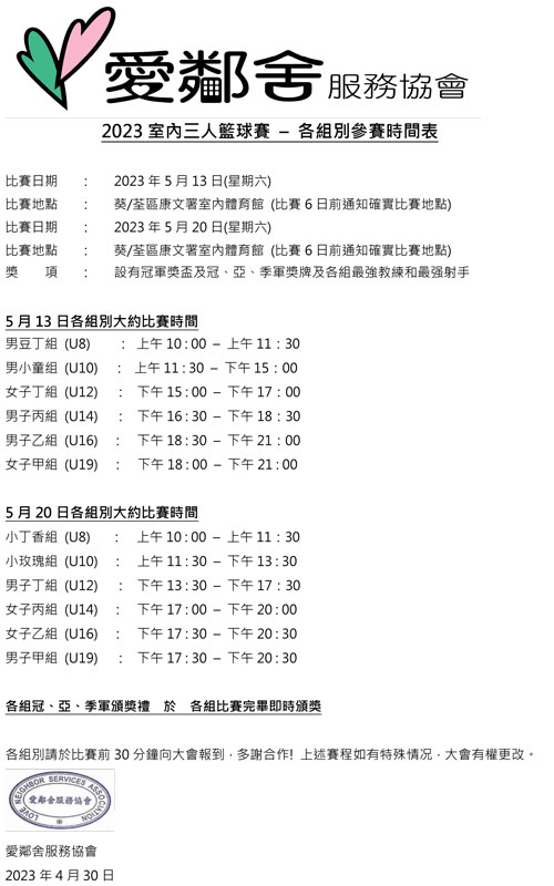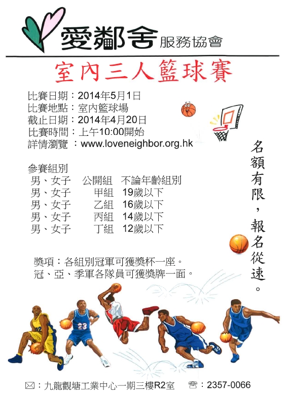 本會經過詳細考慮後,決定取消7月19日(星期六) 的三人籃球賽。| 取消賽程公告 (PDF 版本) |