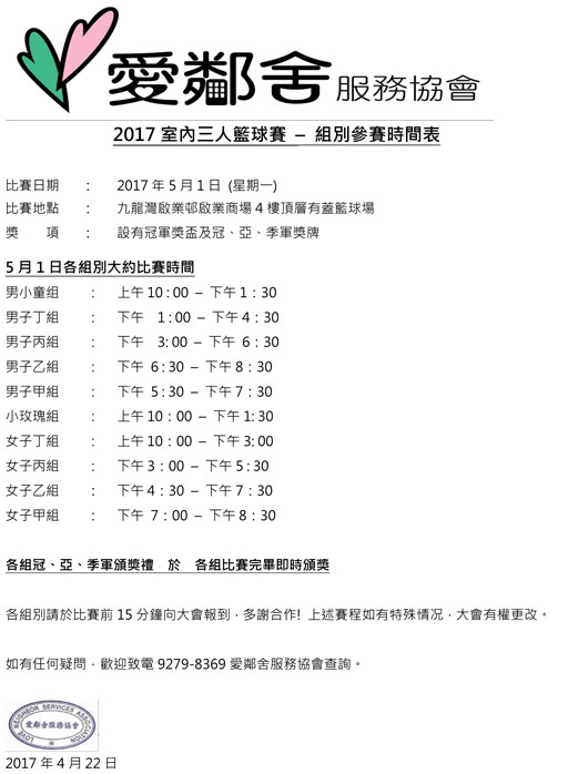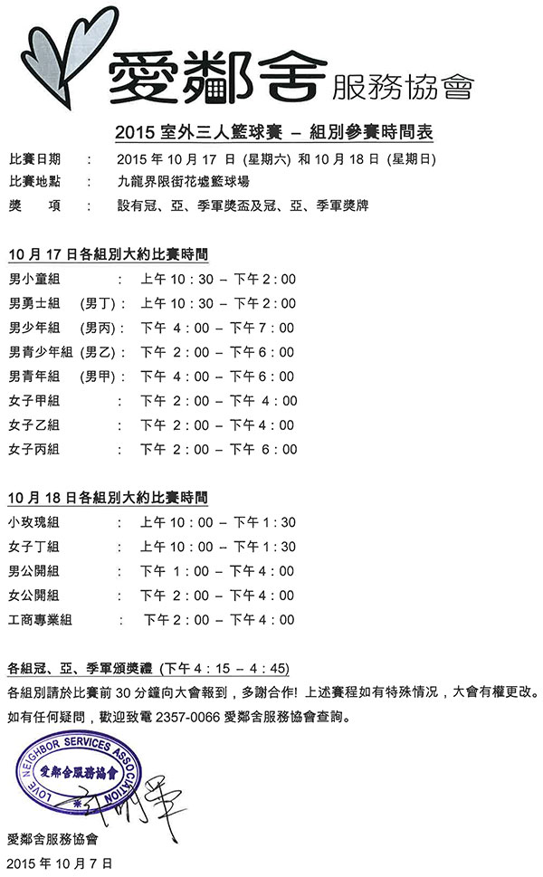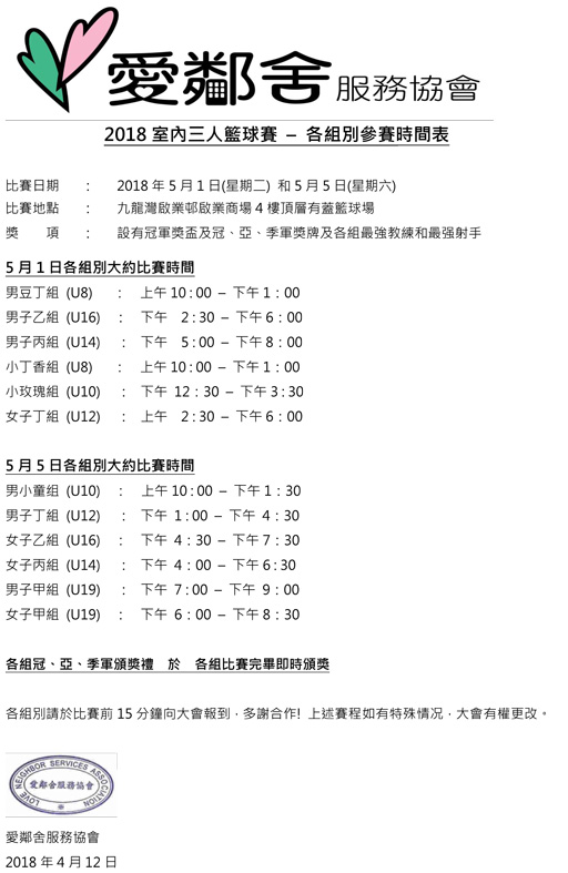 | 比賽地點: | 室外籃球場 (稍後公佈) |
