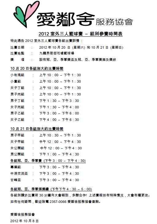 2012年室外三人籃球賽是愛鄰舍服務協會與耳聽心言基金合辦,連續兩天賽事,籌得款項將撥作慈善用途,幫助青海智障孤兒。