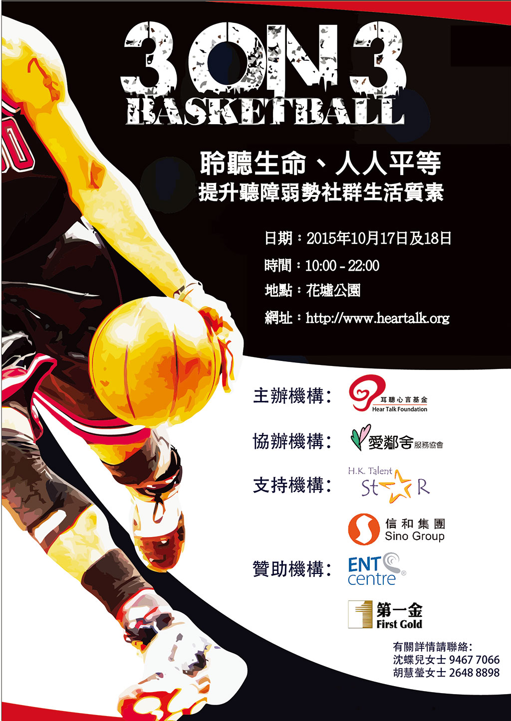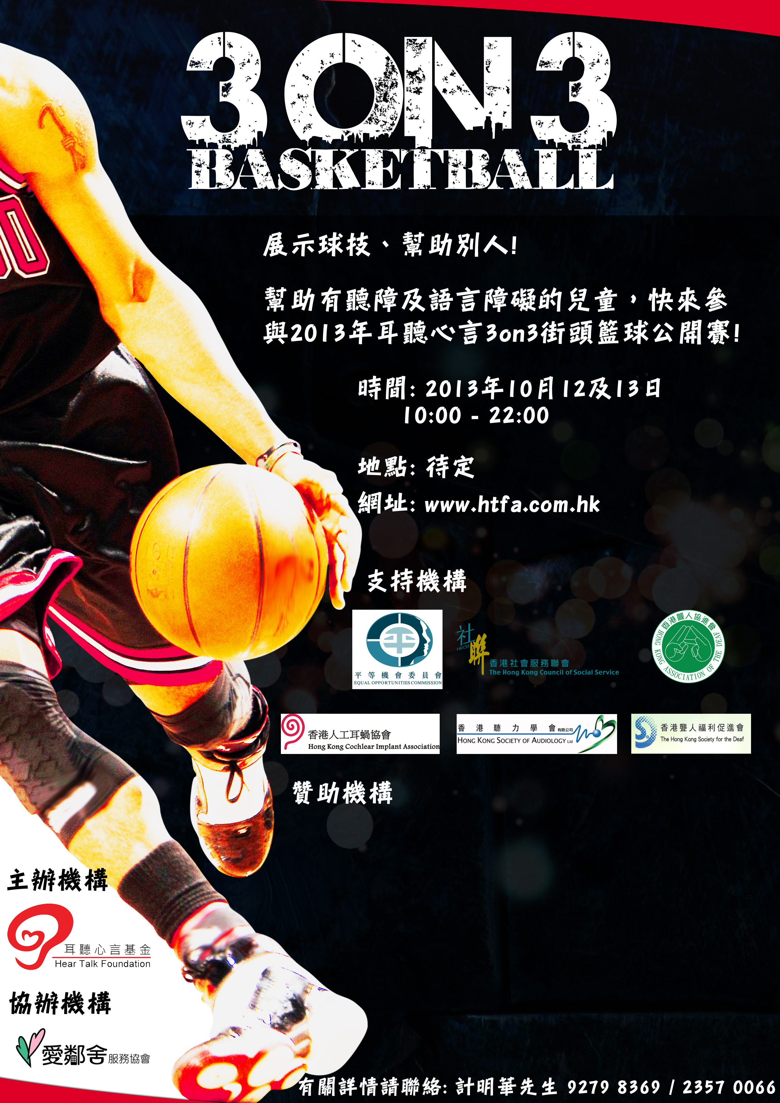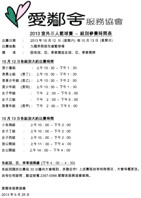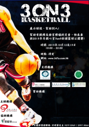 2013年室外開心三人籃球賽是愛鄰舍服務協會與耳聽心言基金合辦,連續兩天賽事,籌得款項將撥作幫助聽障及語言障礙的弱勢社群。
